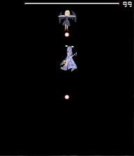東方弾幕風は2Dゲームですが、描画には3Dグラフィクスの機能を用いています。 3Dといえば、よくテクスチャとかポリゴンとか聞くと思います。 テクスチャとは画像です。絵です。 ポリゴンとは3Dグラフィクスで物体をあらわすのに用いる多角形のことです。 ポリゴンを表すのに用いられるのが頂点です 例えば、三角形を表すには、3つの頂点が必要です。 (3つの点を結べば三角形になりますよね) ポリゴンはほとんどが三角形の集合で表されます。 三角形は凸な角だけで構成されたりして都合がよいのです。 さて、弾幕風の自機の画像も、弾の画像も画像ファイルから読み込んだテクスチャの一部を 四角形に切り取って画面に貼り付けているのは、見ただけで分かると思います。 その四角形もポリゴンなのです。 四角形のポリゴンにテクスチャを貼り付けて、絵を表示しているのです。 |