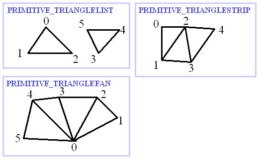 ポリゴンは三角形の集合で表されます。 しかしながら、どのような頂点の並びでどのような三角形の集合を あらわすのか決めないと困ってしまいます。 頂点の並びで定義される図形を決めてやらないといけません。 この頂点の並びで定義される図形をプリミティブといいます。 このプリミティブには三種類が用意されています。 ![]() 例えば四角形を表すには、TRIANGLELISTでは6つの頂点が必要になりますが、 TRAIANGLESTRIPやTRAIANGLEFANでは4つの頂点で表すことができます。 それでは、よくSTGにでてくる曲がるレーザーにはどれが使いやすいでしょうか。 曲がるレーザーにはTRAIANGLESTRIPが使いやすいですよね。 TRAIANGLESTRIPは、最初の頂点からはしご上に連結した形状を表すので 曲がるレーザーのように、途中が曲がったものには最適なのです。 もちろん、TRAIANGLELISTは、ある意味どんな図形でも表現できるので 当然曲がるレーザーを表現することもできますが、 頂点の数が多くなるので面倒なのです。 |