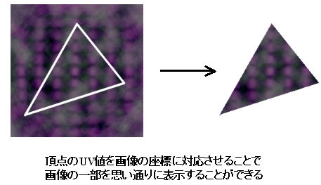UV値はテクスチャ画像における座標をあらわします。 本来は、0-1の値をとります(まあ0-1以外の値をとることもできますが)が、 弾幕風では、画像のx座標がuにy座標がvにそのまま対応します。 ポリゴンを描画するときに、各頂点のUV値をもとにポリゴン上の1点1点が テクスチャ上のどの位置を参照しているのかを求めています。 大雑把にまとめると 画像の切り抜き部分を指定するのがUV値です。 頂点の座標とUV値は異なったものなので、画像を歪めて表示したりもできます。 ![]() |