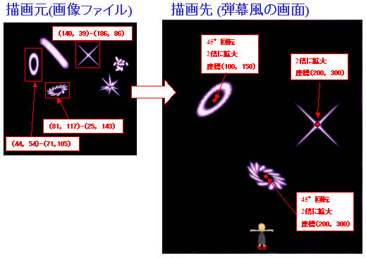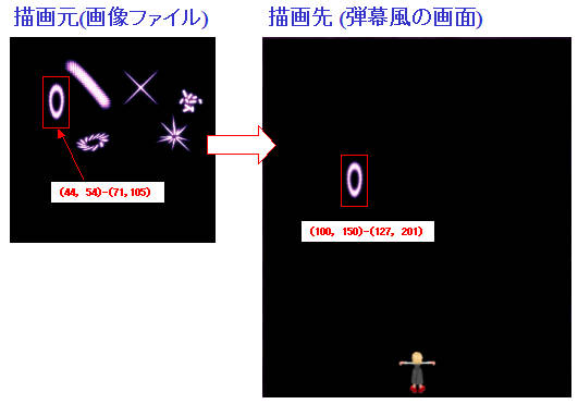 もっとも単純な矩形(長方形)を描画する方法は、 ObjPrim_CreateにOBJ_SPRITE_2Dをわたして生成したオブジェクトを使う方法です。 次の例では、 描画元矩形指定:ObjSprite2D_SetSourceRect 描画先矩形指定:ObjSprite2D_SetDestRect を使用し、画像ファイルの(44, 54)-(71,105)を切り出して、(100, 150)-(127, 201)に表示しています。 ![]() |