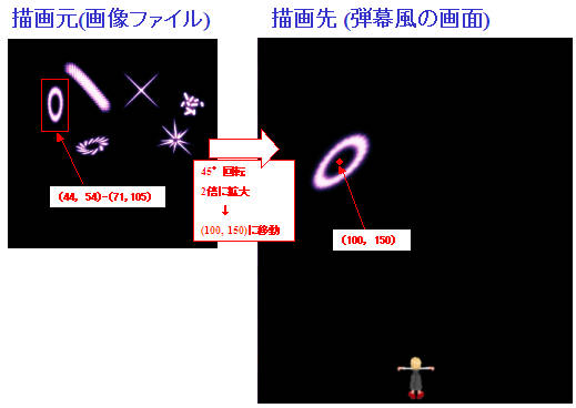 #東方弾幕風[Stage] #ScriptVersion[3] #Title["SampleRB02"] #Text["SampleRB02:矩形(長方形)画像の回転・拡大"] @Initialize { TSample(); } @MainLoop { yield; } task TSample { //画像パス設定 let dir = GetCurrentScriptDirectory(); let path = dir ~ "Effect01.png"; let obj = ObjPrim_Create(OBJ_SPRITE_2D); //2Dスプライトオブジェクト生成 Obj_SetRenderPriorityI(obj, 21); //描画優先度を設定 ObjPrim_SetTexture(obj, path); //テクスチャを設定 ObjSprite2D_SetSourceRect(obj, 44, 54, 71, 105); //描画元設定(44, 54)-(71,105) ObjSprite2D_SetDestCenter(obj); //頂点を(0, 0)中心に配置 ObjRender_SetAngleZ(obj, 45); //45°回転 ObjRender_SetScaleXYZ(obj, 2, 2, 1); //X,Y方向に2倍に拡大 ObjRender_SetPosition(obj, 100, 150, 0); //(100, 150)に移動 //240フレーム待機 loop(240){yield;} Obj_Delete(obj); //描画オブジェクト削除 //ステージ終了 CloseStgScene(); }